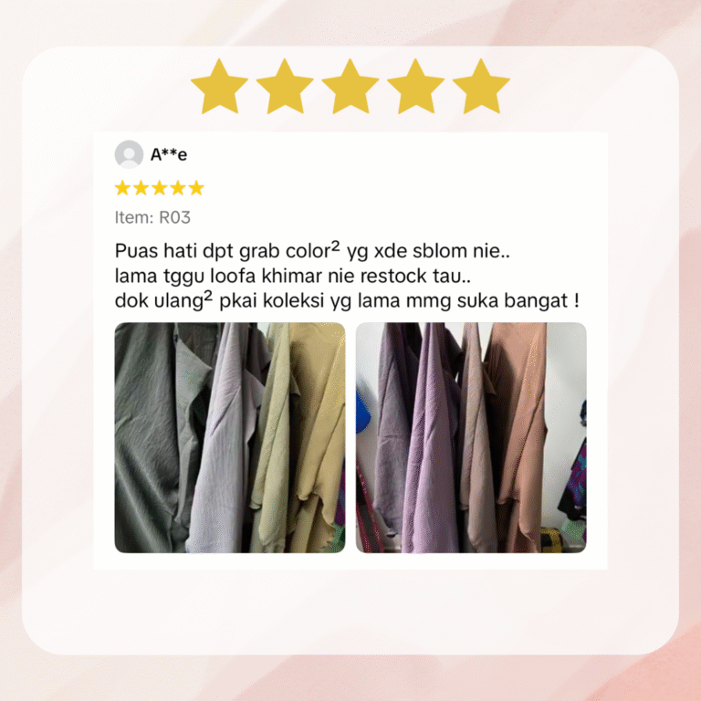 Tapi dengan Loofa Exclusive, anda akan kelihatan anggun walaupun bertudung labuh! Kualiti kain premium dan jahitan rapi memastikan penampilan kekal cantik sepanjang hari.